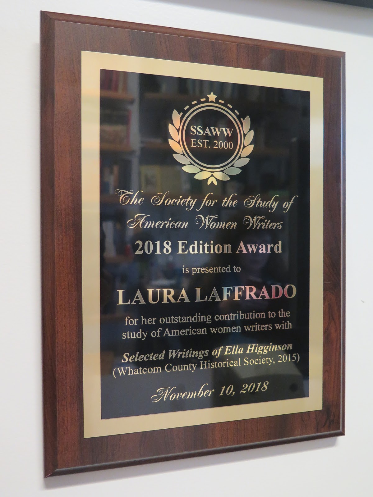 Dr. Laura Laffrado, Director of the Ella Higginson Recovery Project, received the Society for the Study of American Women Writer’s (SSAWW) Edition Award for her book Selected Writings of Ella Higginson (2015) at the SSAWW conference in Denver, Colorado on November 10, 2018. Of the Edition Award, the SSAWW website reports, “The SSAWW Edition Award is given every three years at the Society for the Study of American Women Writers’ conference in order to recognize excellence in the recovery of American women writers.”
