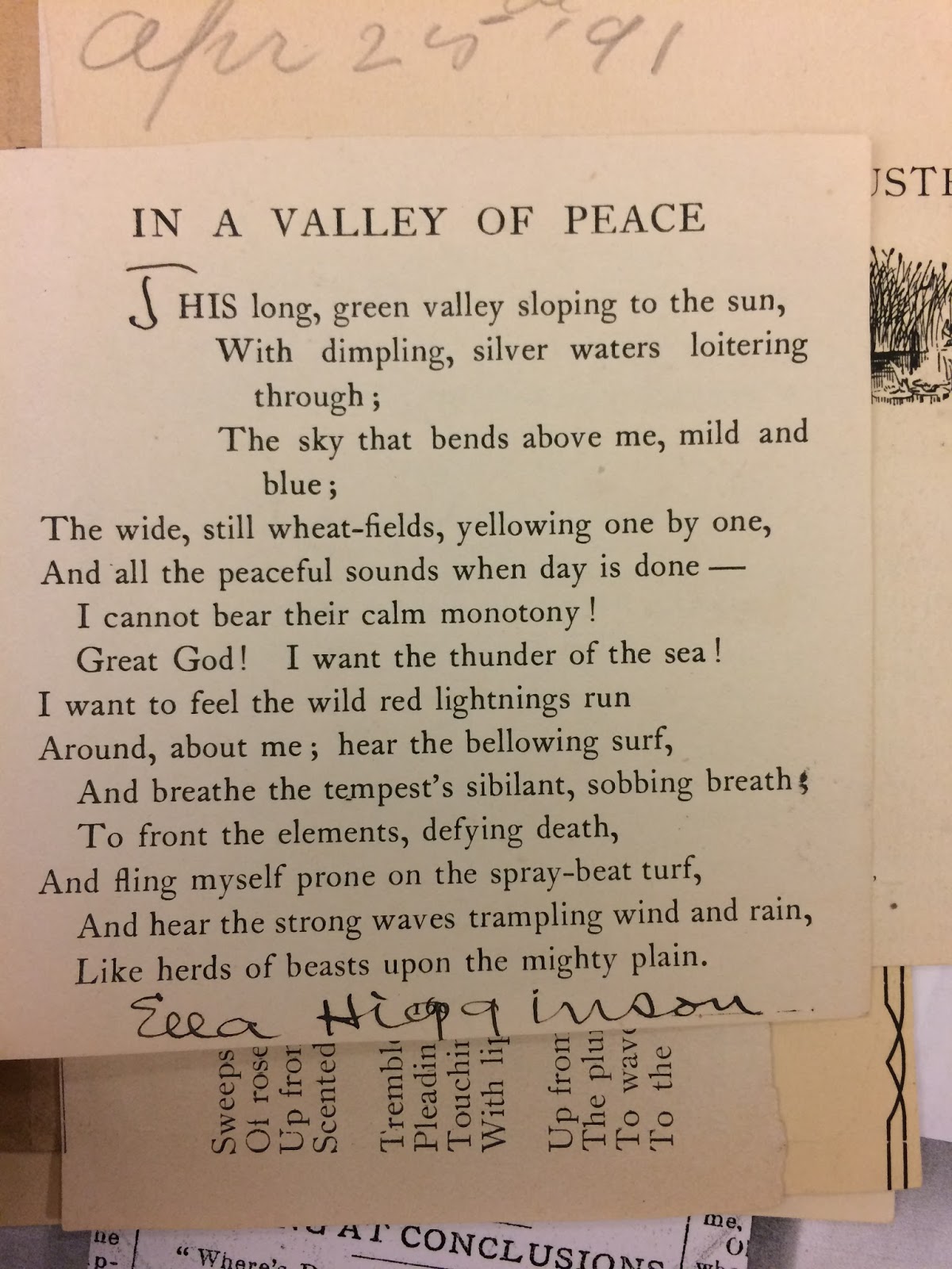 “In a Valley of Peace” printed in an unidentified publication and signed by Ella Higginson. Clipping courtesy of the Ella Higginson Papers, Center for Pacific Northwest Studies, Heritage Resources, Western Washington University, Bellingham Washington.