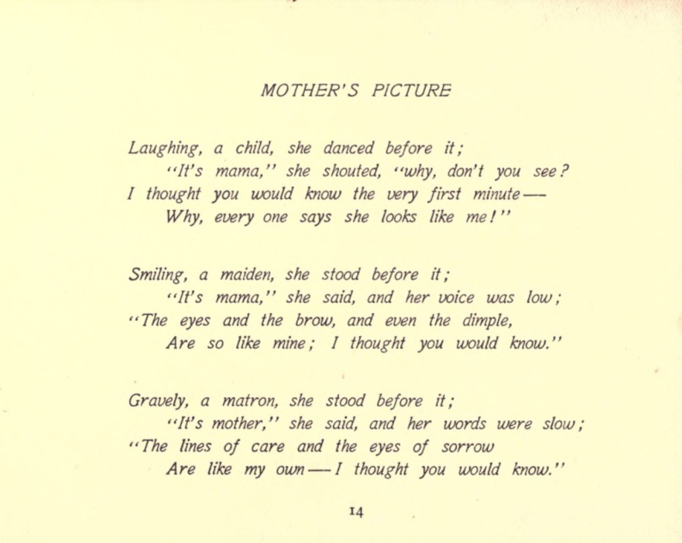 “Mother’s Picture” “Mother’s Picture” as it appears in Higginson’s The Voice of April-Land and Other Poems (1903). “Mother’s Picture” as it appears in Higginson’s Four-Leaf Clover (1901).