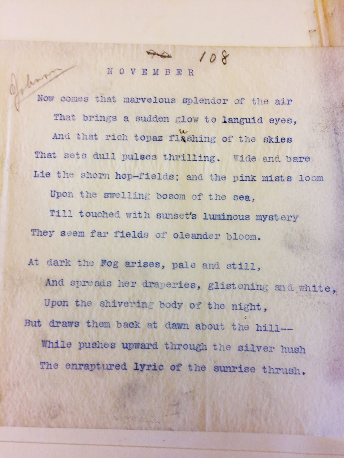 A draft of “November,” courtesy of the Ella Higginson Papers, Center for Pacific Northwest Studies, Heritage Resources, Western Washington University, Bellingham Washington.