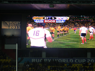 The game started our really well, we held our own against the Aussies, especially when you consider we decided to play our B team to have the best chance to beat Italy in the next game (which we ended up loosing as well, sad day, but oh well). Australia scored the first try, and took a 5-0 lead, and then scored another shortly thereafter, making it 10-0. Then we scored a try and we all went crazy! We now had momentum and got within about a metre of scoring another try to tie it, but they stripped the ball and promptly ran the length of the field and scored again. We never really got momentum back and the final score was 67-5. The result was about what we elected, and it was still great fun for all, there were many more US fans there than I thought there would be due to the fact that all the Kiwis at the game were supporting the US. It was really fun. If games were not so expensive I would totally go to heaps more, but oh well.